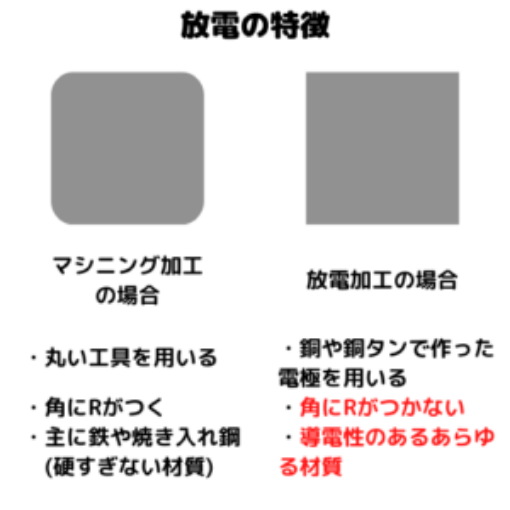 工具Rが付かないため、角形状が必要なザグリ加工は片彫り放電加工でないと加工ができません。